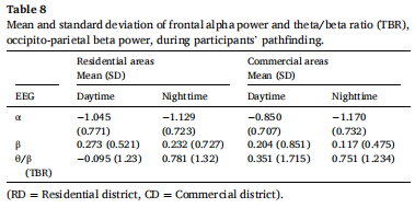 枕顶区β功率的统计结果(见图8和表3)显示,城区的主效应显著(p < 0.001),表明住宅区的β功率高于商业区。这表明,受试者在住宅区的路径决策时经历了更大的波动,增加的β活动阻碍了他们导航和准确记忆环境的能力,影响了他们的空间感知。然而,光环境的主效应不显著(p = 0.414),城区与光环境的交互作用不显著(p = 0.841)。
