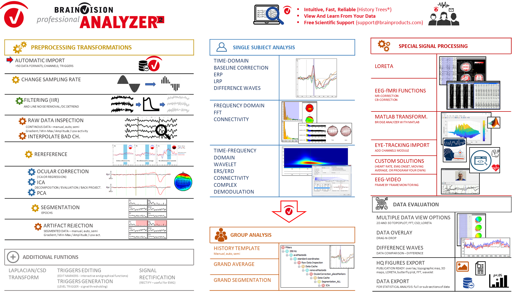• 给予滤波、原始数据检查、交互式 ICA、FFT、Wavelets、功能连接分析、LORETA 等多种方法;